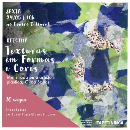 Na oficina de “Texturas em Formas e Cores” que será realizada na sexta-feira (24), às 10h, ministrada pela artista plástica, professora e escritora Gilda Sabas, os participantes terão a experiência de um processo criativo que combina diversos suportes e materiais na criação de uma obra.