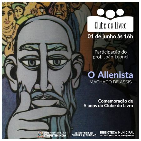 Encerrando a tarde, às 16h, o Clube do Livro fará a leitura e debate do clássico “O Alienista”, de Machado de Assis, e celebrará seu aniversário de cinco anos, com a presença do professor João Leonel, um dos idealizadores e primeiro mediador do Clube do Livro.