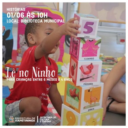 O Lê no Ninho, voltado para crianças de seis meses a quatro anos de idade e seus cuidadores, está marcado para às 10h. No encontro, os pequenos tem a oportunidade de se aproximar do mundo da leitura, por meio de músicas, brincadeiras e contação de histórias.