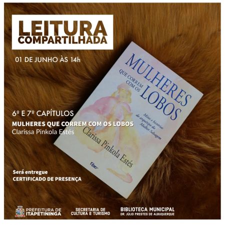 O grupo da Leitura Compartilhada se encontrará às 14h para seguir a partilha da obra “Mulheres que Correm com os Lobos”, de Clarissa Pinkola Estés. A leitura será dos capítulos 6 e 7 e a participação é livre.