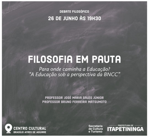 A BNCC – Base Nacional Comum Curricular, que propõe transformações nas diretrizes da educação, é o tema do Debate Filosófico que será realizado na quarta-feira (26) no Centro Cultural “Brasilio Ayres de Aguirre”.
