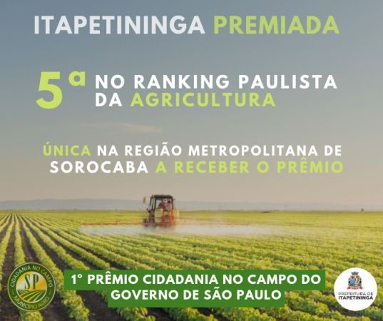 Itapetininga é a 5ª melhor no ranking paulista da agricultura. O levantamento foi feito pelo governo estadual e integra o programa Cidadania do Campo. A premiação ocorreu nesta sexta-feira, dia 26, no Palácio dos Bandeirantes (SP). A colocação garantiu a Prefeitura de Itapetininga um cheque de R$ 62,5 mil.