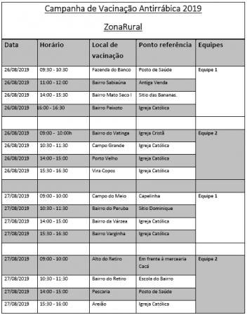 O Setor de Controle de Zoonoses de Itapetininga divulgou nesta quinta-feira (8) o cronograma para Vacinação Antirrábica no município na área rural. A Campanha começa no próximo dia 26 de agosto e se estende até o dia 3 de setembro. Já para a área urbana, a expectativa é de que a Campanha tenha seu início na primeira quinzena de setembro, com a divulgação de uma nova programação nos bairros.