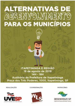 Itapetininga recebe nesta sexta-feira (16) o Seminário “Alternativas de Desenvolvimento para os Municípios” uma realização da Uvesp com o apoio da Desenvolve SP. O encontro será partir de 14h00 no Auditório Municipal “Alcides Rossi”, anexo ao Paço Municipal, com inscrições gratuitas no local.
