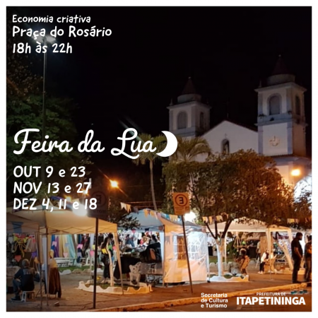 Na Feira da Lua, localizada à praça do Rosário, centro de Itapetininga, há barracas de artesanatos e alimentos orgânicos e naturais, que resgatam as tradições de nossa sociedade e incentivam a Economia Criativa local.