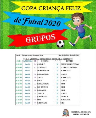 41 equipes divididas entre as categorias sub 08, sub 10, sub 12 e sub 14 com centenas de crianças vão, a partir deste domingo (1º), se enfrentar em disputas emocionantes pela “Copa Criança Feliz de Futsal”, em Itapetininga.