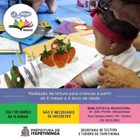 A Biblioteca Municipal “Dr. Júlio Prestes de Albuquerque” realizará mais um Lê no Ninho. Será no próximo sábado, dia 7 de março, às 10 horas. O encontro é de graça e voltado para crianças de 6 meses a 4 anos de idade e seus cuidadores.