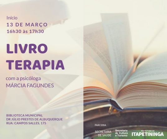 A Biblioteca Municipal “Dr. Júlio Prestes de Albuquerque”, em parceria com a Secretaria de Saúde de Itapetininga, desenvolverá mais um projeto envolvendo livros. O Livroterapia, conduzido pela psicóloga da rede municipal Márcia Fagundes, trabalhará temas sobre autoestima e autoconhecimento femininos, por meio de obras literárias.