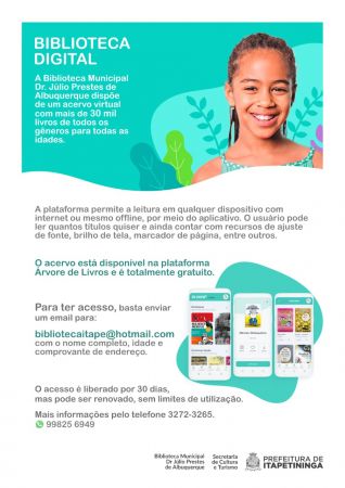 O acervo está disponível na plataforma Árvore de Livros e é de graça. Para ter acesso, basta enviar um e-mail para bibiliotecaitape@hotmail.com ou pelo telefone (15) 99825-6949 e receba um login para ter acesso a uma plataforma com mais de 30 mil livros de todos os gêneros para todas as idades.