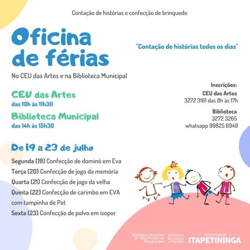 Haverá contação de histórias e confecção de brinquedos todos os dias. Para participar, é necessário se inscrever por telefone ou pessoalmente no local em que a criança desejar participar. As oficinas são de graça e cada criança pode se inscrever em até duas atividades.