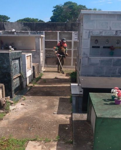 Em uma força tarefa, equipes trabalham para fazer a roçagem e limpeza do mato nos Cemitérios São João Batista e do Santíssimo, que ficam na Vila Rio Branco.