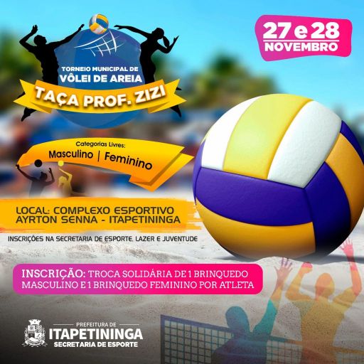Nos dias 27 e 28 de novembro ocorrerá a Taça Vôlei de Areia – Prof. Zizi. A modalidade praticada na areia foi inventada em 1895, nos Estados Unidos. Dispostos a praticar o esporte na praia, nas areias da Califórnia.