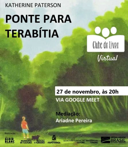 O livro escolhido é “Ponte para Terabítia”, de Katherine Paterson e a mediação será da psicóloga Ariadne Pereira. Ela explica que “a obra foi escolhida pela temática, que valoriza a amizade, a criatividade e o valor da família. Apesar de ser um livro voltado para o público infantojuvenil, todos podem tirar proveito do enredo”.