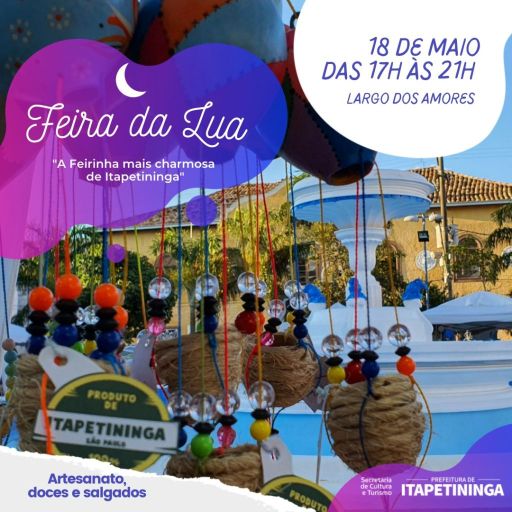 Uma nova edição tradicional “Feira da Lua”, em Itapetininga, será realizada nesta quarta-feira, dia 18 de maio, no Largo dos Amores, das 17h às 21h. O evento, que é promovido pela Secretaria de Cultura e Turismo da cidade, traz artesanato, doces e salgados e se tornou a feirinha mais charmosa da cidade.