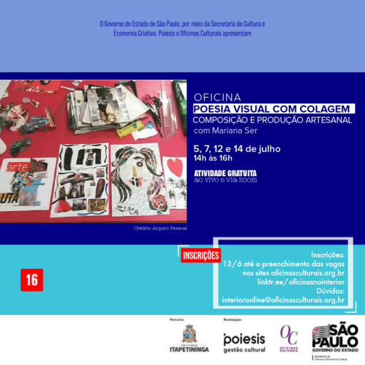 A Prefeitura de Itapetininga, por meio da Secretaria de Cultura e Turismo divulga inscrições para a Oficina de Poesia Visual com Colagem – Composição e Produção Artesanal