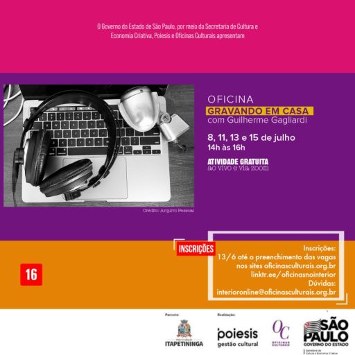 A Prefeitura de Itapetininga, por meio da Secretaria de Cultura e Turismo divulga inscrições para a Oficina “Gravando em Casa”.