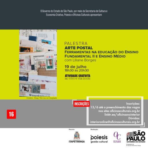 A Prefeitura de Itapetininga, por meio da Secretaria de Cultura e Turismo, informa que estão abertas as inscrições para a palestra Arte Postal – Ferramentas na Educação do Ensino Fundamental I e II e Ensino Médio.