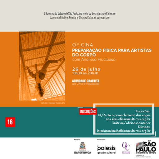 A Prefeitura de Itapetininga, por meio da Secretaria de Cultura e Turismo, divulga que estão abertas as inscrições para a Oficina “Preparação Física para Artistas do Corpo”.