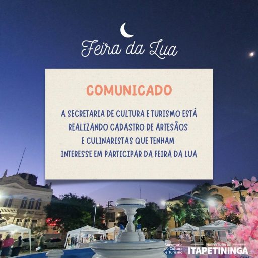 A Prefeitura de Itapetininga por meio da Secretaria de Cultura e Turismo de Itapetininga está realizando cadastro de artesãos e culinaristas que tenham interesse em participar da Feira da Lua.