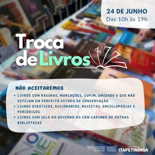 Será realizada nesta sexta-feira, dia 24, a Troca de Livros, das 10h às 19h.