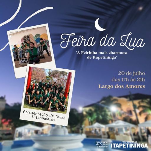 A “Feira da Lua”, em Itapetininga, será realizada nesta quarta-feira, dia 20, no Largo dos Amores, das 17h às 21h. O evento, que é promovido pela Secretaria de Cultura e Turismo da cidade, traz artesanato, doces e salgados e se tornou a feirinha mais charmosa da cidade. E nesta quarta, terá apresentação de taiko com o grupo Nisshindaiko.
