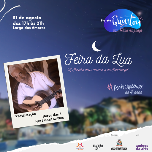 Nesta quarta, dia 31, a Feira da Lua contará com a apresentação de Darci das Seis, um cantador popular, participou de diversos festivais de música na região. No repertório, clássicos da MPB, com canções de Chico Buarque, Zé Ramalho, Geraldo Azevedo, Caetano Veloso, entre outros.