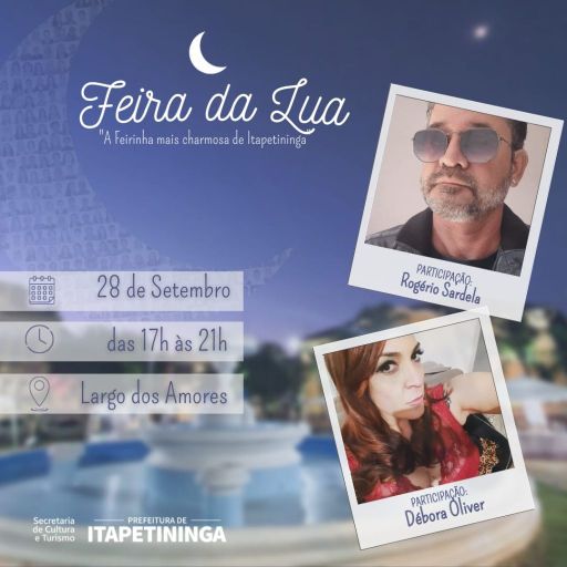 Nesta quarta, dia 28, a Feira da Lua contará com a apresentação musical de Rogério Sardela e Débora Oliver, cantando clássicos da MPB e Pop/Rock Nacional.