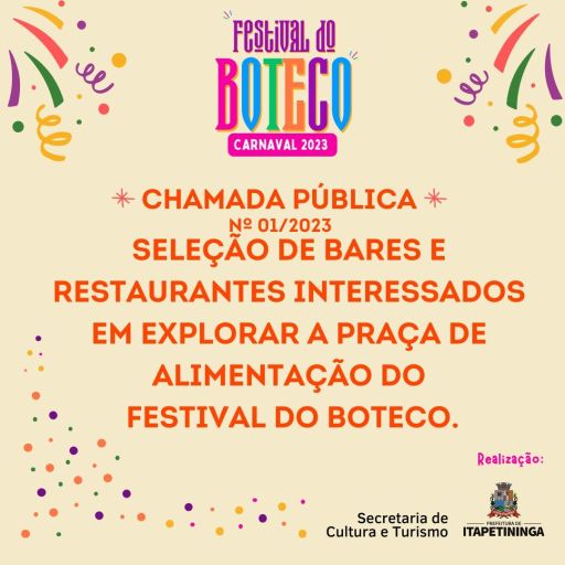 Os bares e restaurantes interessados em explorar a Praça de Alimentação do Festival do Boteco 2023, podem participar da Chamada Pública nº 01/2023. O Festival será realizado na semana do Carnaval, de 16 a 21 de fevereiro, no Largo dos Amores.
