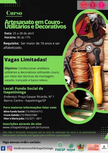Qualificação é a oportunidade para emprego e renda. Com esse objetivo, o Fundo Social de Solidariedade de Itapetininga está com vagas abertas para curso gratuito de Artesanato em Couro – Utilitários e Decorativos. O curso é uma promoção da gestão municipal e uma parceria com o Senar e Sindicato Rural da cidade. Inscrições já estão abertas e devem ser feitas por meio do site: www.sritapetininga.com.br/cursos