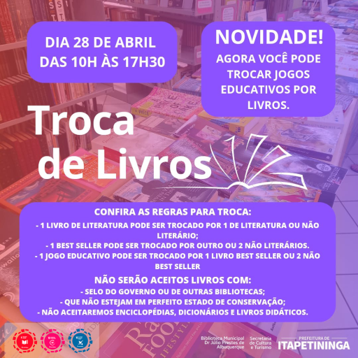 A Biblioteca Municipal “Dr. Júlio Prestes de Albuquerque”, em Itapetininga, promove na próxima sexta-feira, dia 28, das 10 às 17h30, mais uma edição da “Troca de Livros”. Desta vez, jogos educativos, como tabuleiro e quebra-cabeça, também serão aceitos para troca.