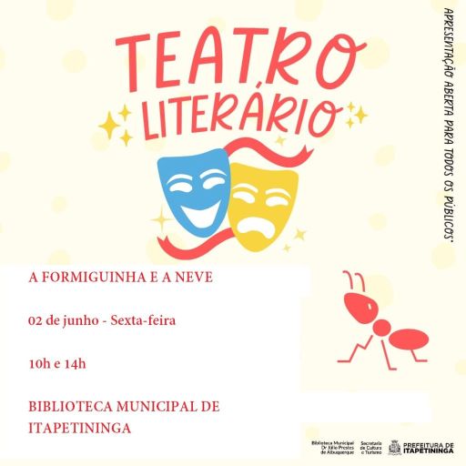 A Biblioteca Municipal “Dr. Júlio Prestes de Albuquerque”, em Itapetininga, recebe o projeto “Teatro Literário” em dose dupla, na próxima sexta-feira (02), às 10h e às 14h, com as encenações das peças “A Formiga e a Neve”, de João de Barros e “A Bonequinha de Pano”, de Ziraldo.