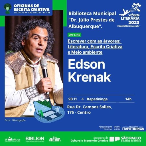 A Biblioteca Municipal “Dr. Júlio Prestes de Albuquerque” irá promover o segundo módulo da Oficina de Escrita Criativa, que nesta edição será de forma virtual, e irá acontecer dia 28 de novembro, terça-feira, às 14 horas, com o escritor Edson Krenak, com a temática “Escrever com as árvores: Literatura, Escrita Criativa e Meio Ambiente”. A oficina é gratuita e voltada para maiores de 16 anos.