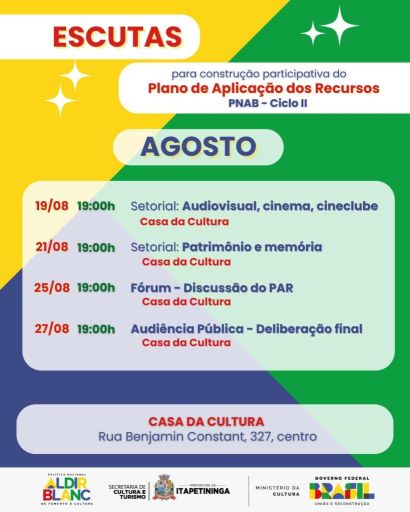 A escuta setorial sobre Patrimônio e Memória, inicialmente marcada para 18 de agosto, foi remarcada para o dia 21 de agosto, às 19h, na Casa da Cultura.