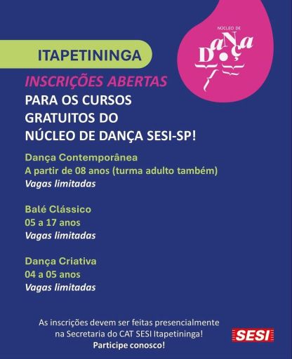 As inscrições devem ser realizadas presencialmente na secretaria do CAT SESI Itapetininga, na Av. Padre Antônio Brunetti, 1360 - Vila Rio Branco.