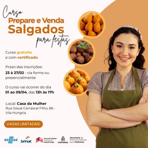 A Prefeitura de Itapetininga, por meio da Secretaria de Políticas Públicas para Mulheres, abre, entre os dias 23 e 27 de fevereiro, as inscrições para o curso gratuito “Prepare e Venda Salgados para Festas”, realizado em parceria com o Sebrae. A capacitação será presencial, na Casa da Mulher de Itapetininga, e acontecerá de 1º a 9 de abril, das 13h às 17h.