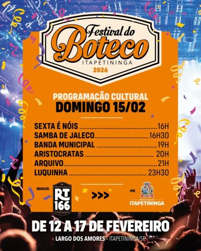 O Festival acontece na quinta (12) e sexta-feira (13), a partir das 17h, e de sábado (14) a terça-feira (17), a partir das 14h. O evento conta com o apoio da Prefeitura de Itapetininga, por meio da Secretaria Municipal de Cultura e Turismo, além de parceria e realização da iniciativa privada.
