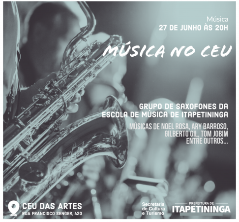O Grupo de Saxofones da Escola de Música de Itapetininga interpreta canções clássicas da Música Popular Brasileira no “CEU das Artes”, na quinta-feira (27), às 20h. A "Música no Ceu" é uma iniciativa da Prefeitura de Itapetininga, por meio da Secretaria de Cultura e Turismo.