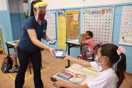 Cada criança recebe um tubo de álcool em gel e máscara. Todos os equipamentos de EPI estão comprados e à disposição dos estudantes.
