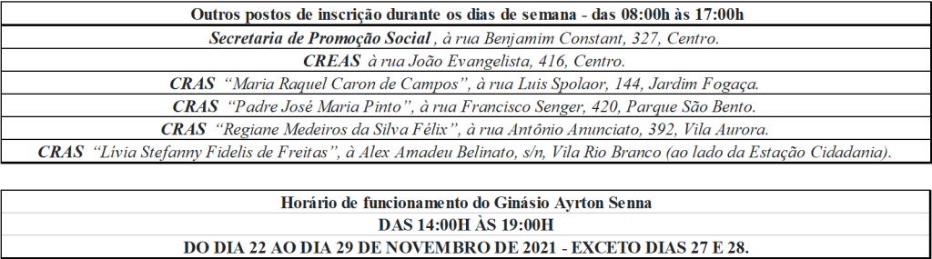 Também serão abertas as portas do Ginásio Municipal de Esportes “Ayrton Senna da Silva” nas mesmas datas acima, mas com horário diferenciado, das 14h às 19h.