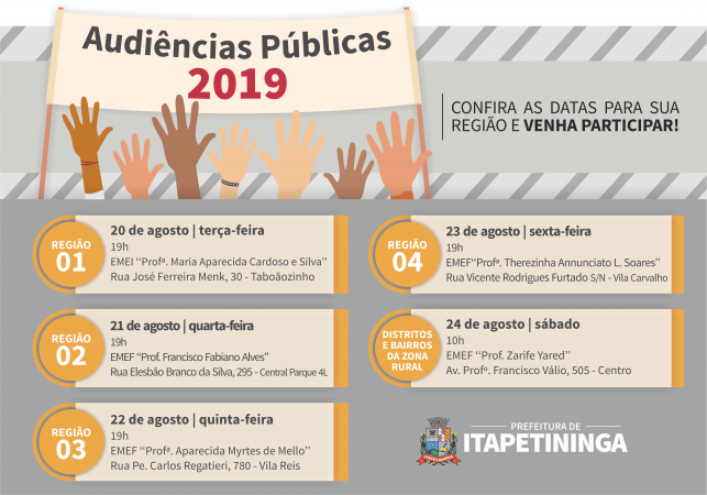 A Prefeitura de Itapetininga inicia no dia 20 de agosto, às 19h, na EMEI “Profª Maria Aparecida Cardoso e Silva” localizada à rua José Ferreira Menk, 30, Taboãozinho, uma série de encontros com a população, as chamadas audiências públicas, afim de receber sugestões para alteração do PPA-Plano Plurianual 2018 a 2021, elaboração da LDO-Lei de Diretrizes Orçamentárias 2020 e LOA-Lei Orçamentária Anual 2020, os problemas identificados na cidade, direcionando os investimentos em sua proposta orçamentária para o ano de 2020.
