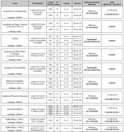 O Centro Educacional Profissionalizante Municipal (Ceprom), em Itapetininga, começa na próxima segunda-feira, dia 3, as inscrições para 10 cursos para o primeiro semestre de 2020. Serão 439 vagas distribuídas para as seguintes áreas: Assistente de Contabilidade, Assistente de Departamento Pessoal, Costureira de Máquina Reta e Overloque, Eletricista Instalador, Gestão de Recursos Humanos, Informática Básica, Inglês Modulo 1 e Inglês Modulo 2. Também serão abertas turmas para Cabelo e Designer de Sobrancelhas, não tem data ainda definidas.