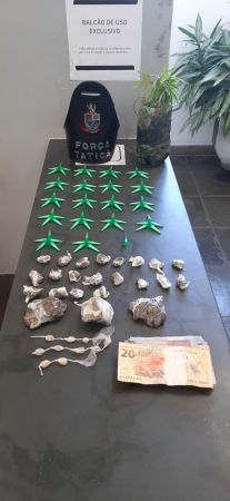 A integrante do Canil, a fêmea Ákila, da raça Belga Mallinois, fez a busca e encontrou diversos tipos de entorpecentes. Foram localizados em um matagal 111 g de maconha, 67 g de cocaína, 3g de crack e 1 pé de maconha em um vaso improvisado numa garrafa pet. Os dois suspeitos foram levados para o Plantão Policial e ficaram à disposição da Justiça.