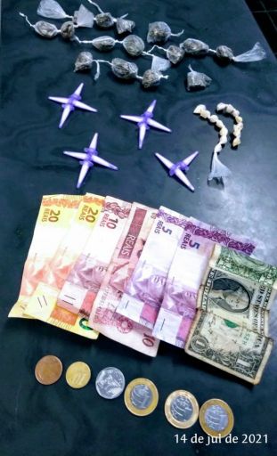 Durante a revista pessoal, com o auxílio do Grupo de Operações com Cães da GCM – Canil, foram encontradas em uma pochete, 15 porções de maconha, 15 pedras de crack, 15 pinos de cocaína e R$ 73,40 em notas miúdas, além de um dólar.