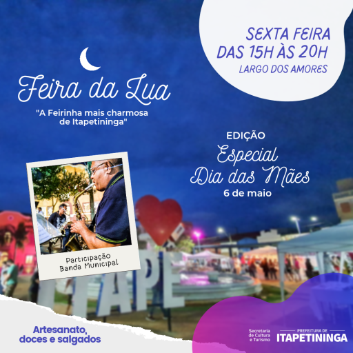 Uma edição especial da já tradicional “Feira da Lua”, em Itapetininga, será realizada na nesta sexta-feira, dia 06, no Largo dos Amores, das 15h às 20h. Será em comemoração ao Dia das Mães.