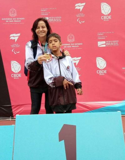 Eduardo Bento - EMEF “Profª Maria de Lourdes B. Carvalho", bateu seus próprios recordes e ganhou 3 medalhas de ouro nos 100, 250 e 1000 metros em corrida de cadeira.
