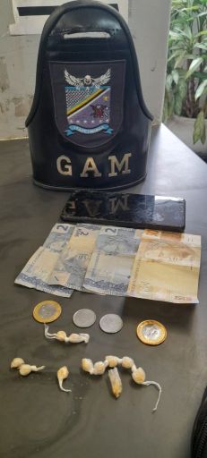 Durante revista pessoal, foi localizada em sua pochete certa quantidade de dinheiro e drogas. O suspeito confessou que estaria comercializando os entorpecentes.