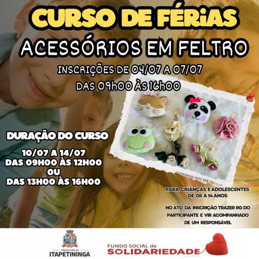 A Prefeitura de Itapetininga, por meio do Fundo Social, oferece um curso voltado para as crianças no período de férias escolares, em julho. As inscrições começam nesta terça-feira, dia 4, para o curso de Acessórios em Feltro. O objetivo, conforme a gestão municipal, é fortalecer a cidadania e a educação das crianças.