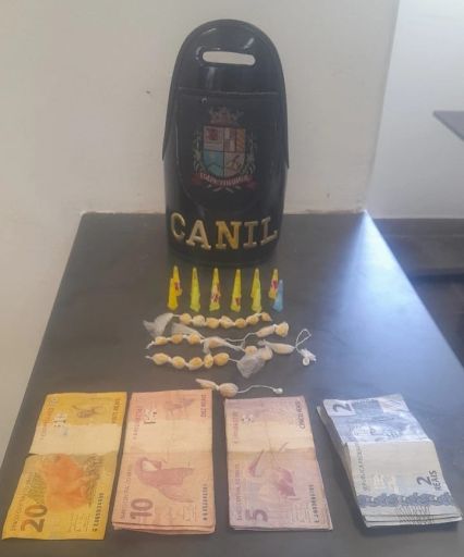 As equipes Canil e do Grupamento de Apoio com Motocicletas - GAM desconfiaram do comportamento do homem que, ao ver a viatura, saiu correndo, jogando durante sua fuga, um saco plástico. Alcançado e abordado pelo GAM, foi encontrado no bolso de sua bermuda a quantia de R$ 122,00 em espécie.