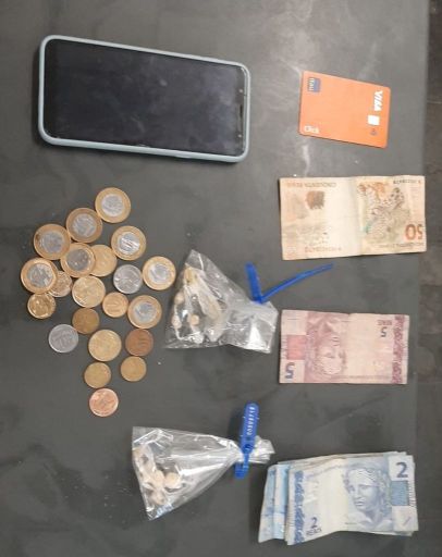 Durante a revista pessoal realizada no menor que havia dispensado algo ao chão foi encontrada a quantia de R$ 82,00 em notas diversas e, com o auxílio dos cães farejadores Balrog e Beretta, foram localizadas seis pedras de crack no local onde o jovem havia dispensado algo.