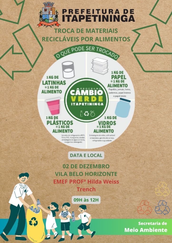 A nova edição do “Câmbio Verde” será realizada na Vila Belo Horizonte, no dia 2 de dezembro, a partir das 9h até 12h. É o momento de levar os papéis, papelão, plásticos, vidros, garrafas PET e latinhas que estão separados em casa e trocar por alimentos. O “Câmbio Verde” é um programa da Prefeitura de Itapetininga, organizado pela Secretaria do Meio Ambiente. A proposta, inédita na região, troca materiais reciclados por 1 kg de alimento.
